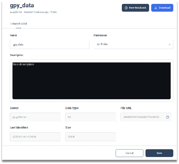 - On this page you can review detailed information such as: owner, data type, url to the file, last modified date and size of the data. You can then modify: the name, the access level (public, private), and its description to facilitate other user’s researches.