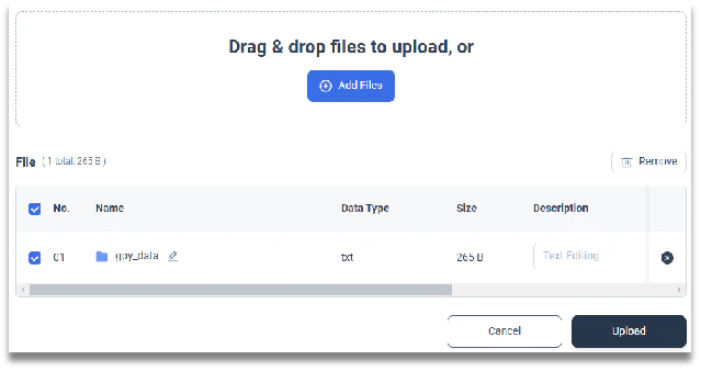 - You can drag and drop your data or use a file picker to select the datasets you want to upload. We support: TXT, XML, XLSX, CSV formats. Then click the files to Upload and confirm the Upload by clicking [Upload] button.